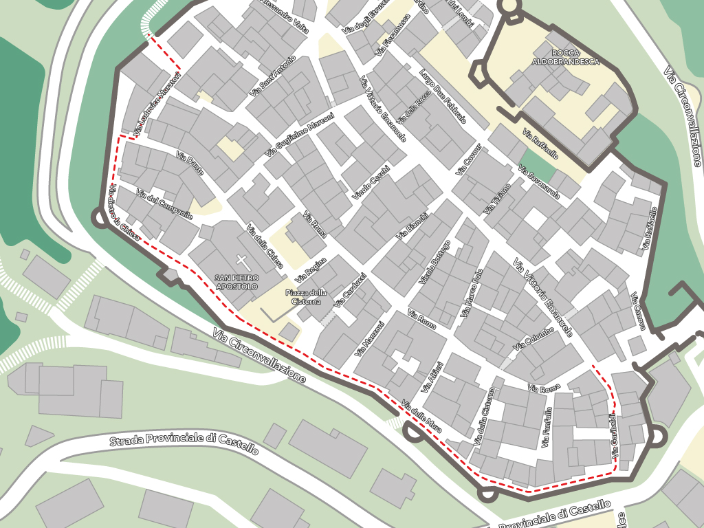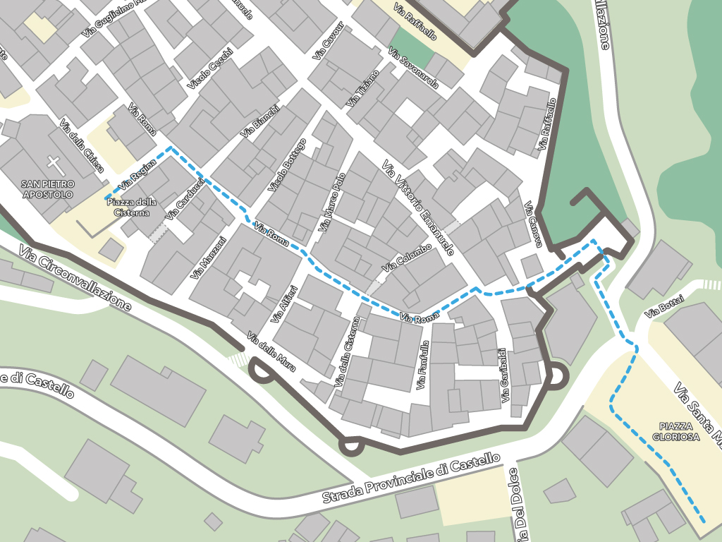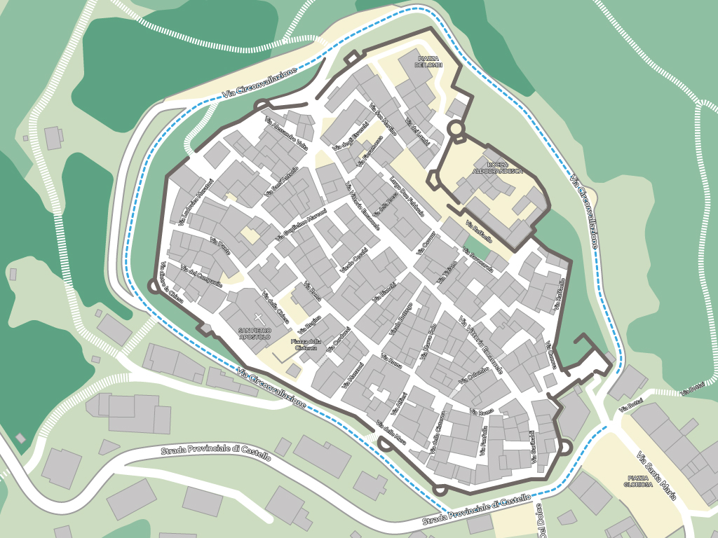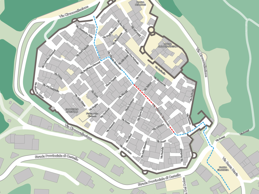 The route passes through the medieval village enclosed by the walls, starting from the Gloriosa Square, once the site of the church of S. Mary.