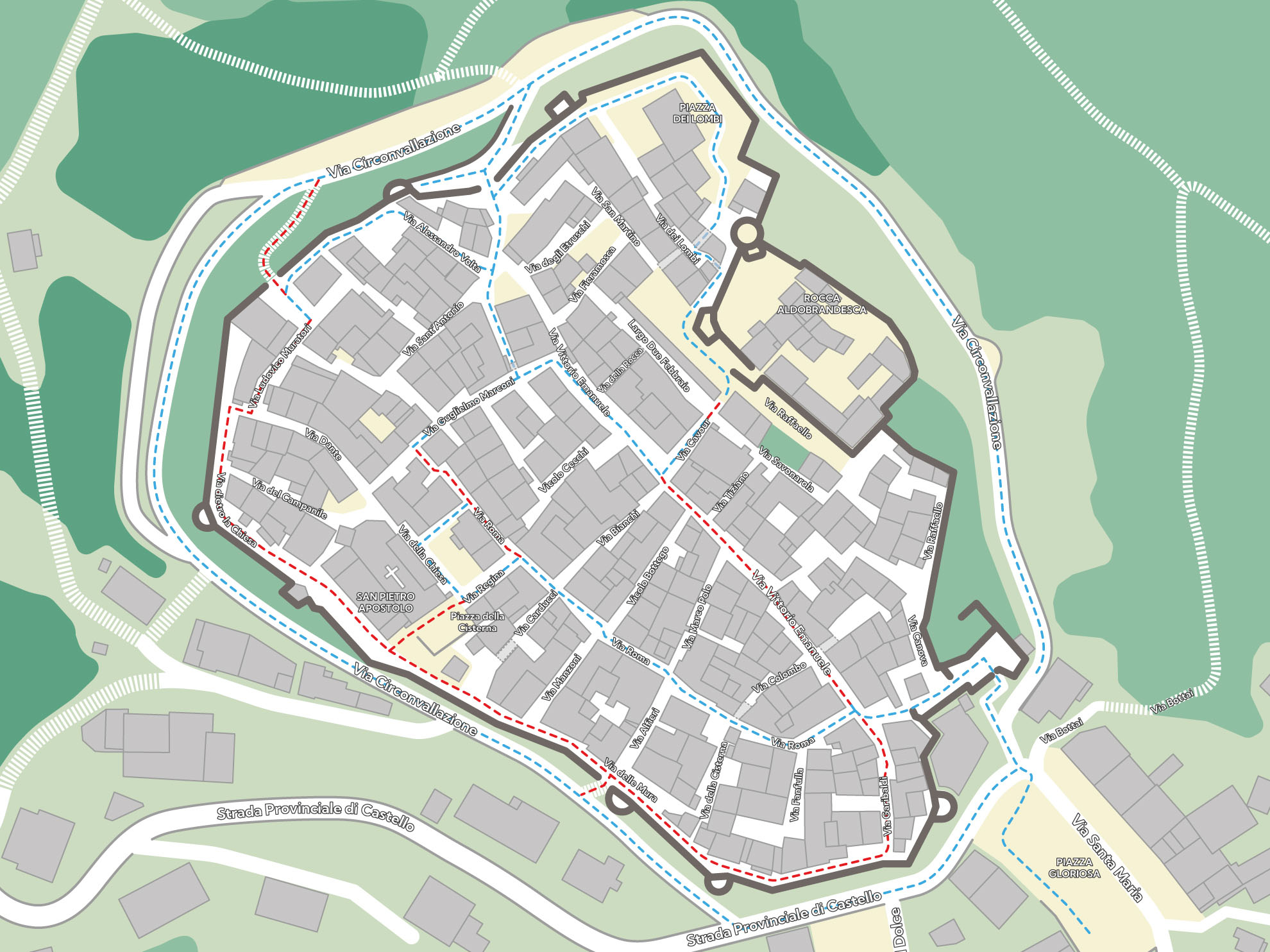 The route begins at the town hall, which in ancient times was the praetorian palace, the most importantbuilding in the community, and continues along thering of walls internally. Thus it is possible to see the structure of the towers, patrol paths and the relationship with thebuilt-up area.