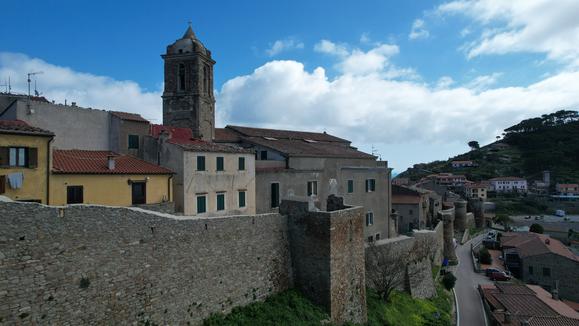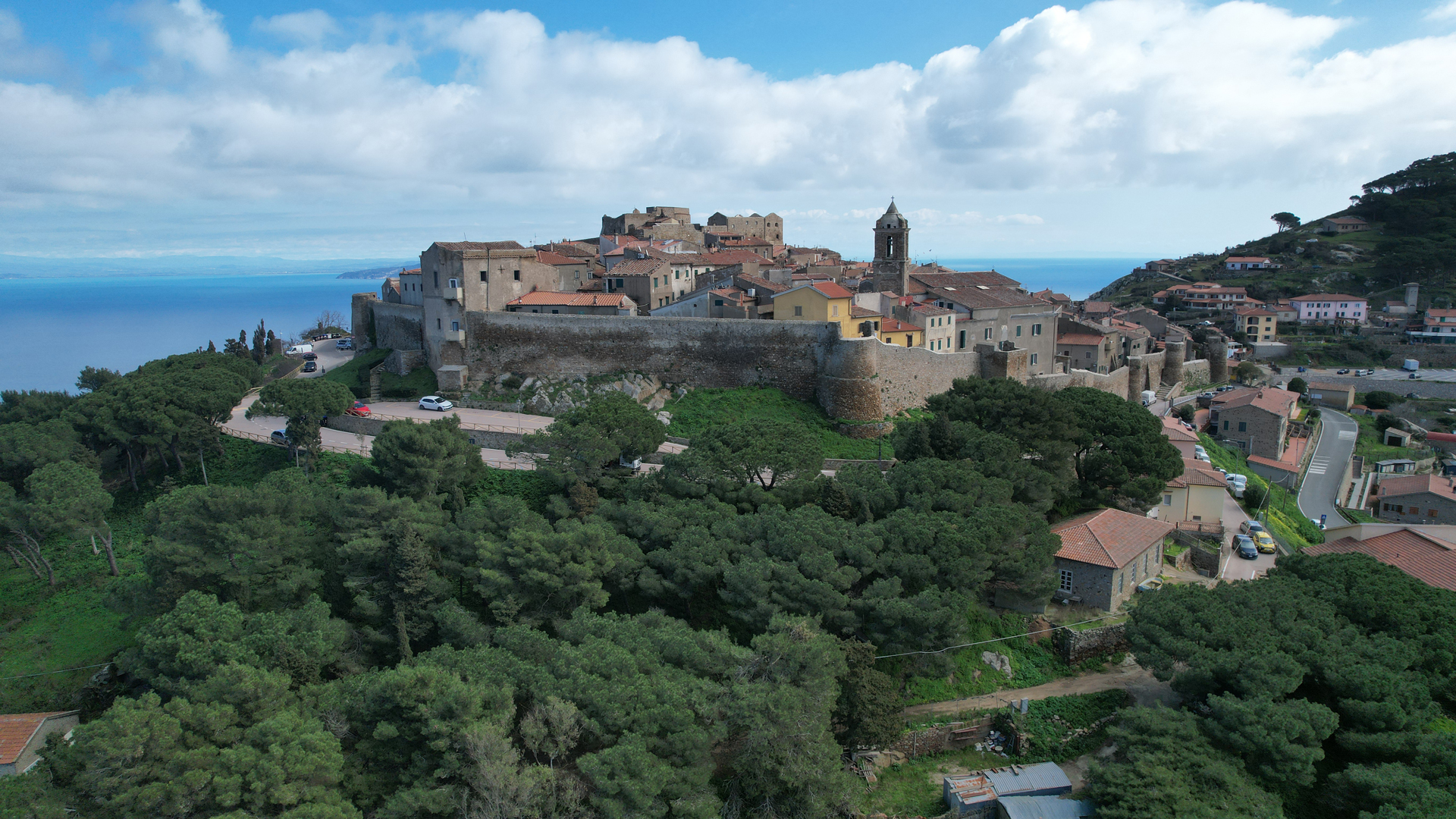 L'immagine mostra il borgo fortificato di Giglio Castello, situato sull'Isola del Giglio in Toscana, in una vista aerea.
