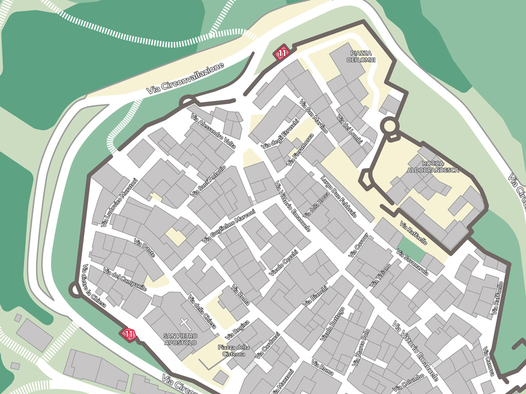 Due torri di forma quadrangolare nel circuito murario esterno si discostano dalle altre che hanno invece una forma semicircolare.