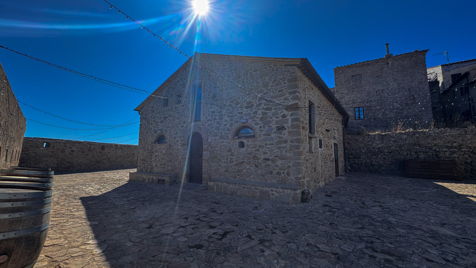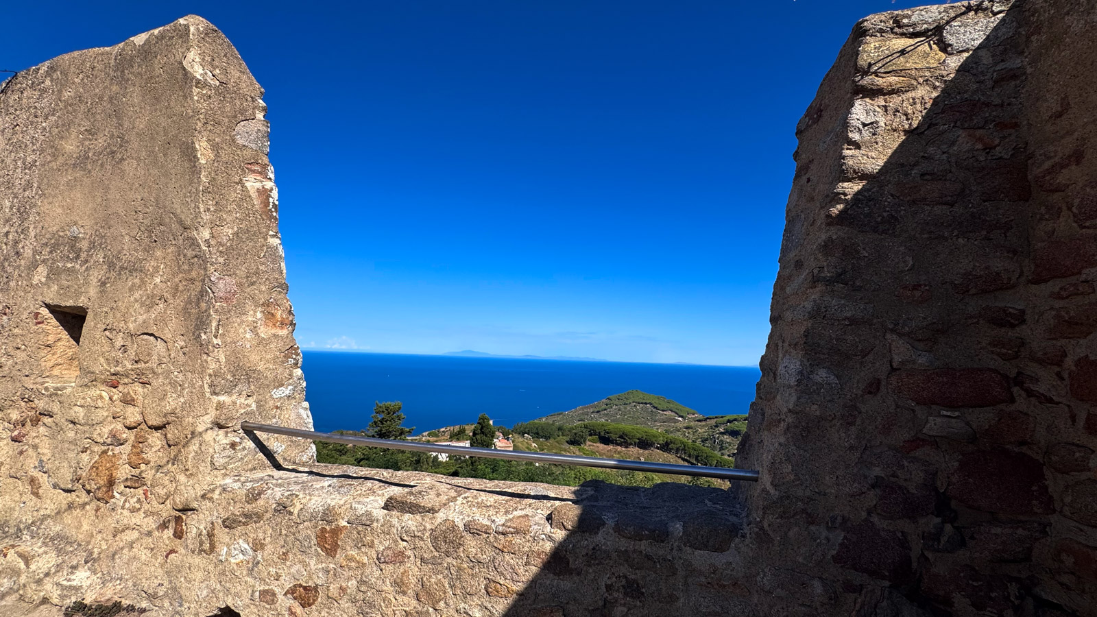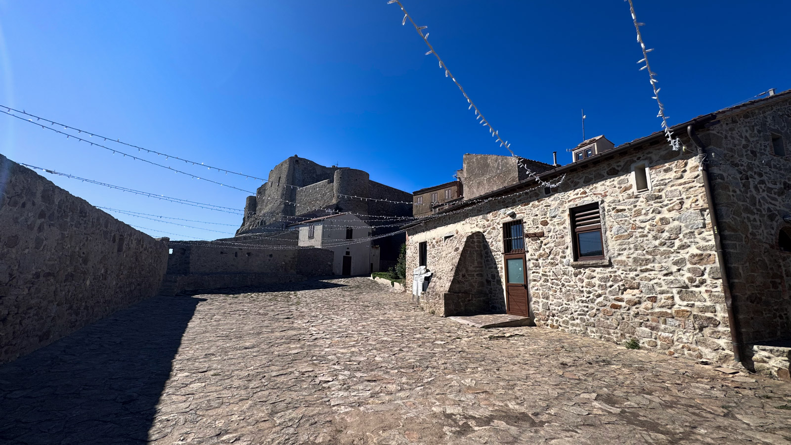 La foto mostra una piazza in pietra nel centro storico del borgo. Sulla sinistra c'è un muro di pietra, mentre sulla desta una casa in pietra. L'immagine mostra una piccola piazza con un edificio in pietra. La struttura è costruita con pietre grezze e presenta un portale ad arco e piccole finestre. L'immagine ritrae una vista panoramica sul mare e su una parte di un promontorio della costa toscana